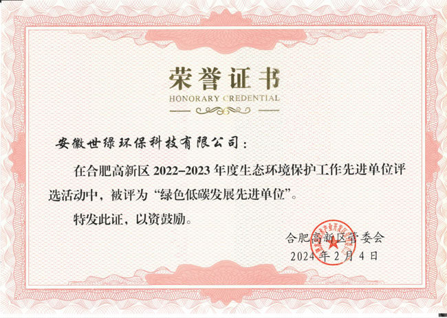 近日,在合肥高新區(qū)2022-2023年度生態(tài)環(huán)境保護(hù)工作先進(jìn)單位評(píng)選活動(dòng)中,我公司被評(píng)為“綠色低碳發(fā)展先進(jìn)單位”。